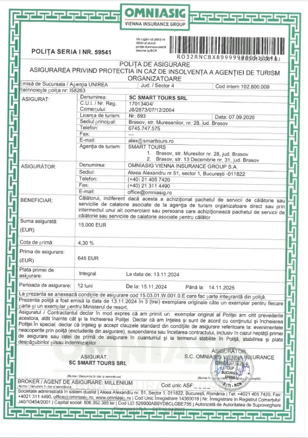 Asigurare de insolvabilitate și faliment: Polița Seria I – Numărul 53488 emisă de Omniasig Vienna Insurance Group SA valabilă 15.11.2019 – 14.11.2020.