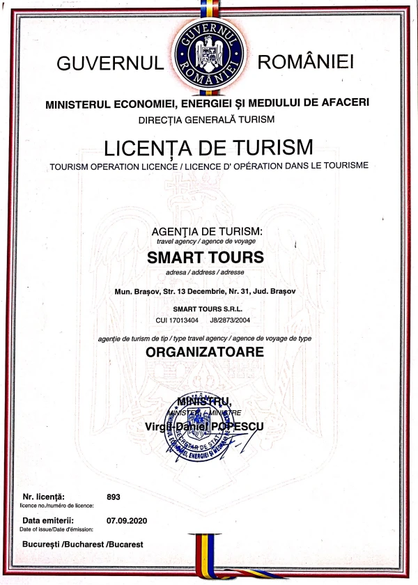 Operatorul de date cu privire la site-ul nostru este: SMART TOURS SRL, cu sediul in Str. 13 Decembrie, Nr. 31, Brasov / 500199 – Romania. Puteti contacta operatorul de date scriind la adresa mentionata anterior sau prin e-mail la contact@smarttours.ro